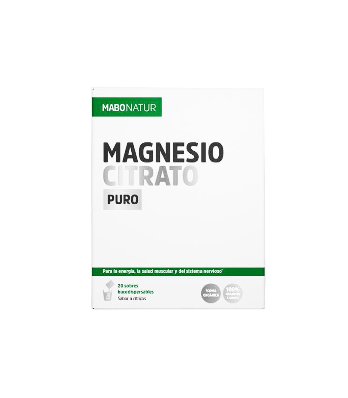 Mabonatur Magnesio Citrato Puro es un complemento alimenticio de magnesio de alta absorción que ayuda al funcionamiento normal de músculos y sistema nervioso, contribuye al metabolismo energético y a la reducción del cansancio y la fatiga. Se presenta en sobres bucodispersables, fáciles de tomar y con sabor agradable.